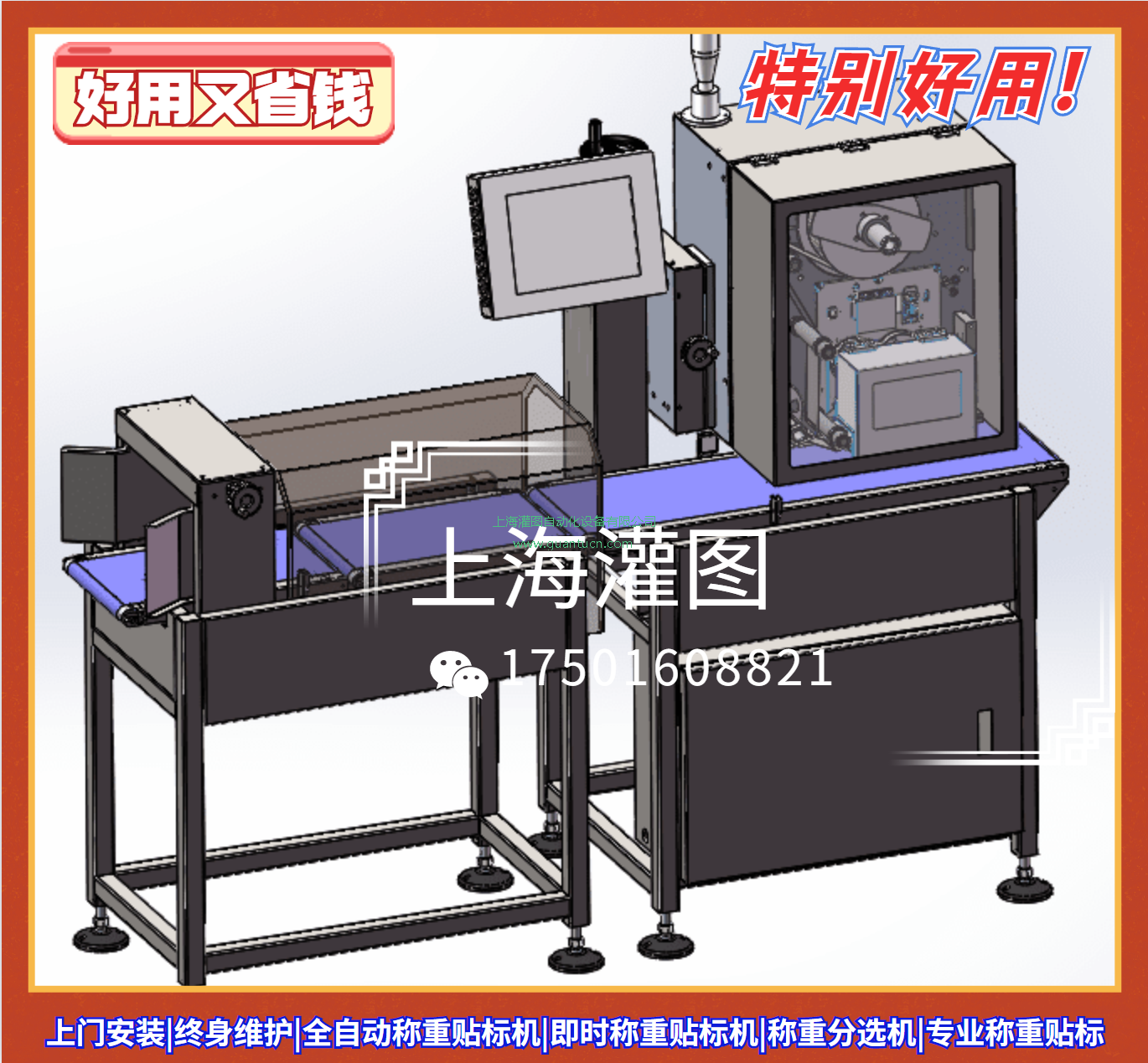 特点:灌图研发的实时打印贴标系统,是将热传打印和自动贴标融为一体的实时打印贴标,高、低成本的优点;运用于自动化生产线与物流环节中,实现将实时信息自动即打即印的自动化称重贴标机。创新设备外观,打破速度60/min(贴标),