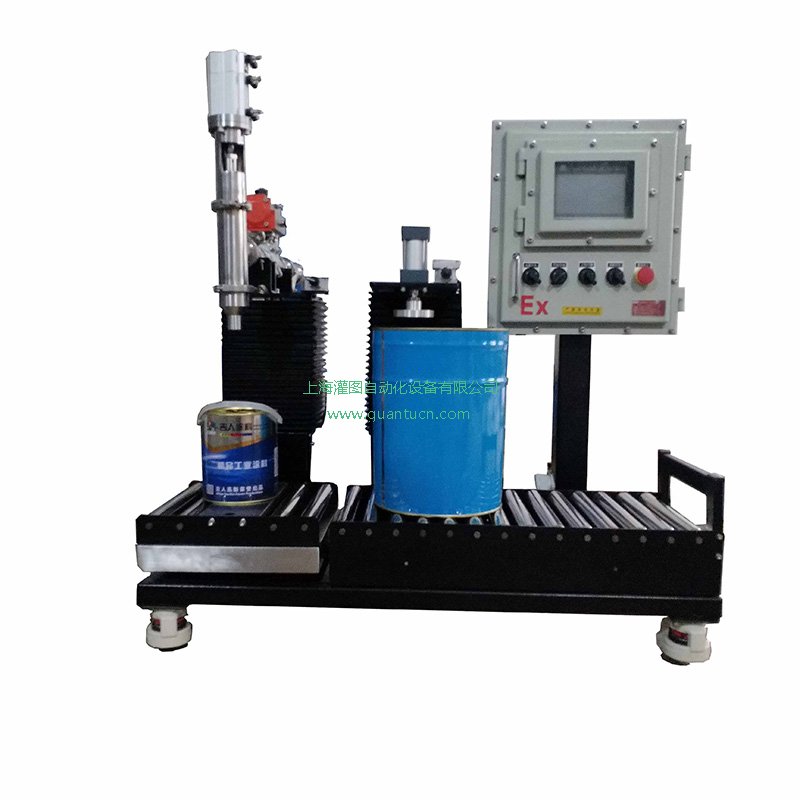 设计独特的灌装头装置易于操作,灌注快速、准确;并且较大限度地保证灌注完毕时残液的滴漏。操作时,操作者先将空桶空桶区按下启动按钮,空桶将自动输送到相应的灌装磅台上,系统自动转桶捕获桶口,当桶口对准灌装头,灌装头就会自动插入桶内,并将空桶自动去皮,然后打开灌装阀门,准确地双速灌装;灌装结束,灌装秤头自动提升至桶外,滴漏盘自动接至灌装头底部。等4桶灌装完成时,自动启动输送机将包装桶送到放盖旋盖位置,旋盖完成后推到分桶器自动分桶后上移栽机自动码垛,码垛完成后自动将托盘送到下托盘工位,叉车叉走,即告完成。防滴地面防滑处理环氧树脂胶全自动灌装机-10L洗手消毒液灌装设备厂家。